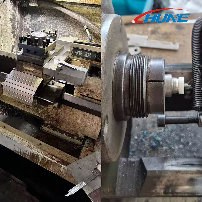 U radionici je majstor Cai koristio poseban naoštreni alat za brušenje utora kalupa malo po malo. Kolotura je tako mala da je dubina utora mogla biti samo 0,6 mm. "To je kao da naoštrite štapić - čak i milimetar, a beskoristan je", rekao je. Prilagođeni kalup gotovo je držao materijal, a onda smo ga predali CNC tokarilici: postavili parametre i pustili stroj da oblikuje F-tip remenice u U-tip. Uzorak je napravljen!
